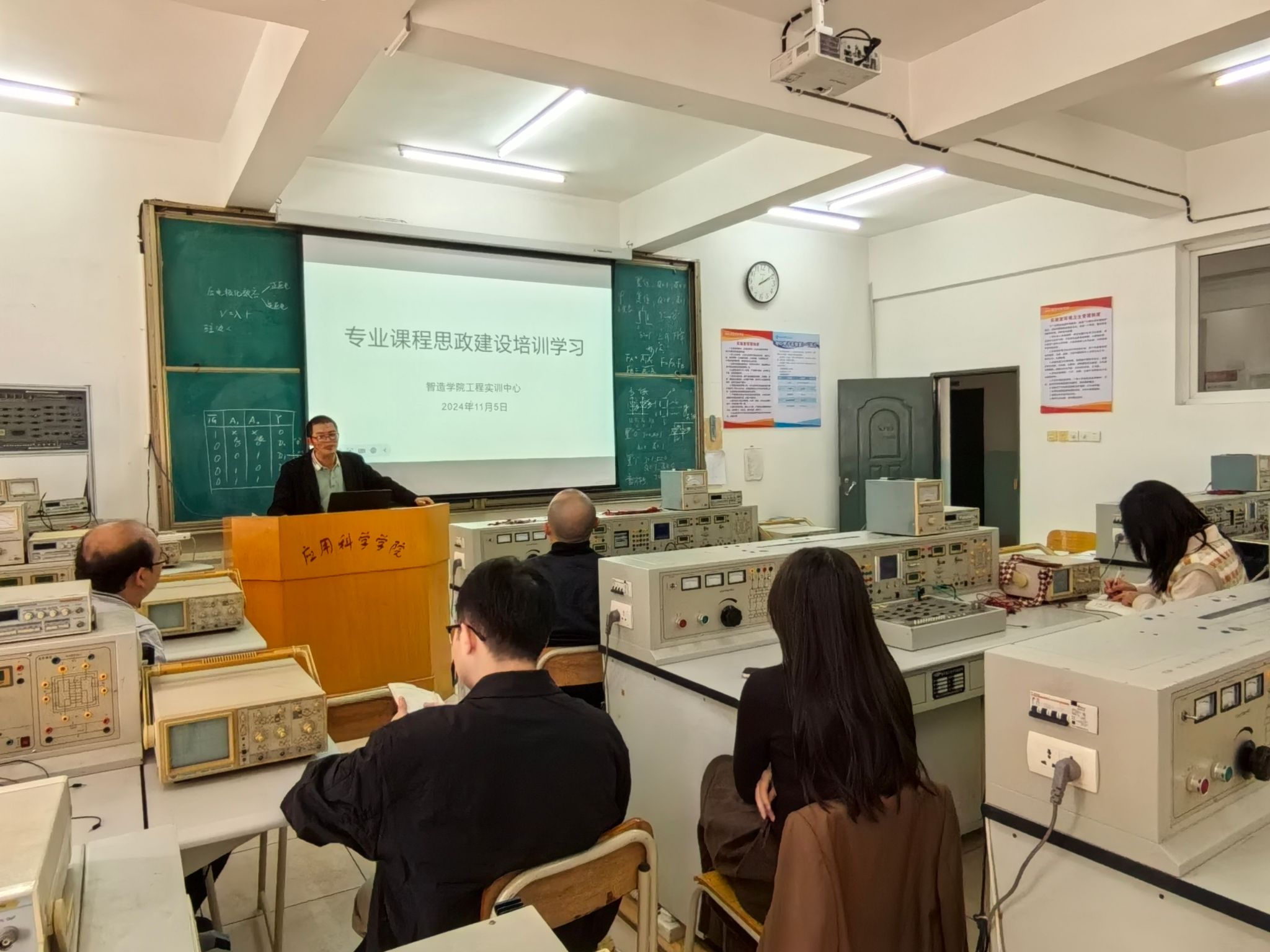 本网讯:11月05日,智造公司实训中心于工程楼S302教室举办专业课程思政建设培训学习活动。本次培训的主要内容是如何在专业课程中融入思政内容,旨在加强教师思政意识,提升专业课程与思想政治教育的融合效果。此次会议由实训中心主任钟涛生主持,实训中心全体人员参加会议。