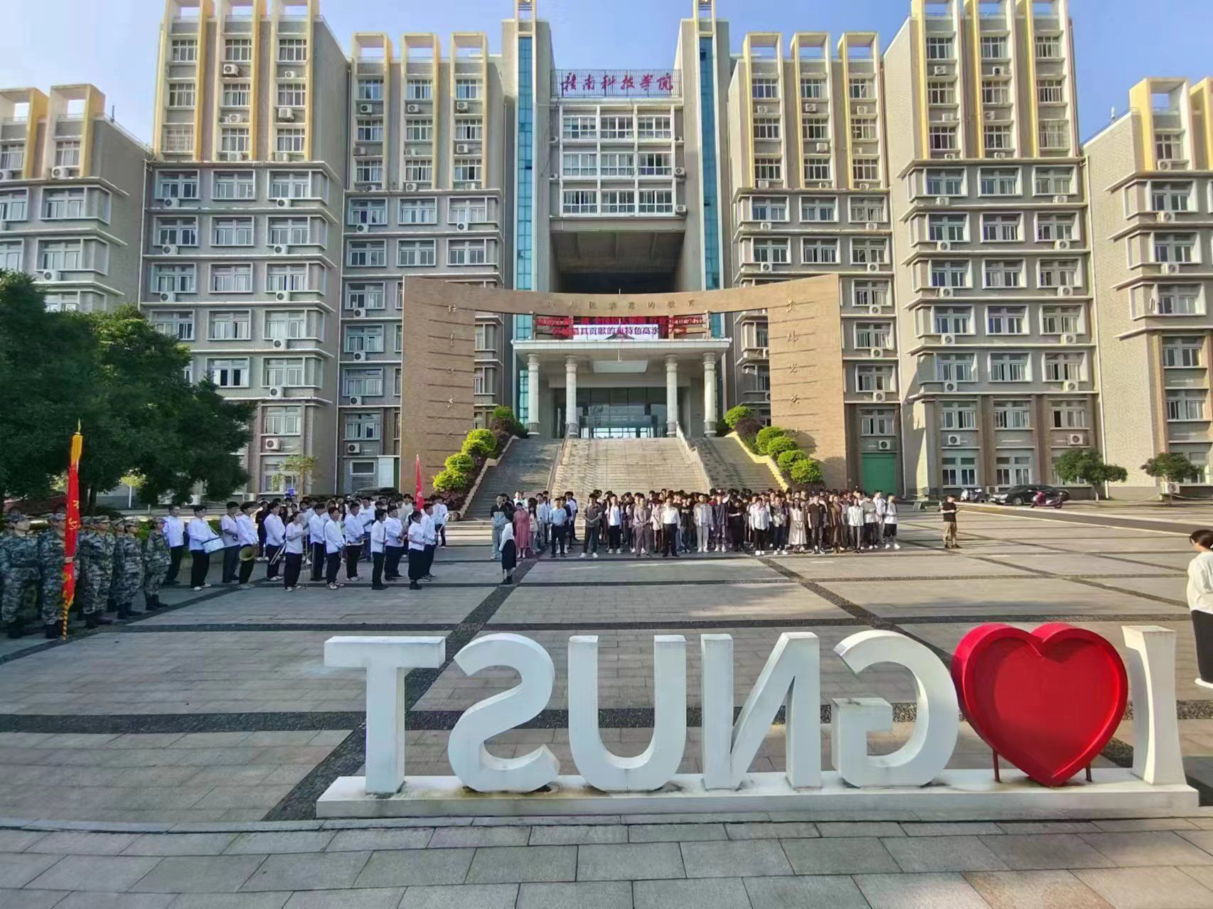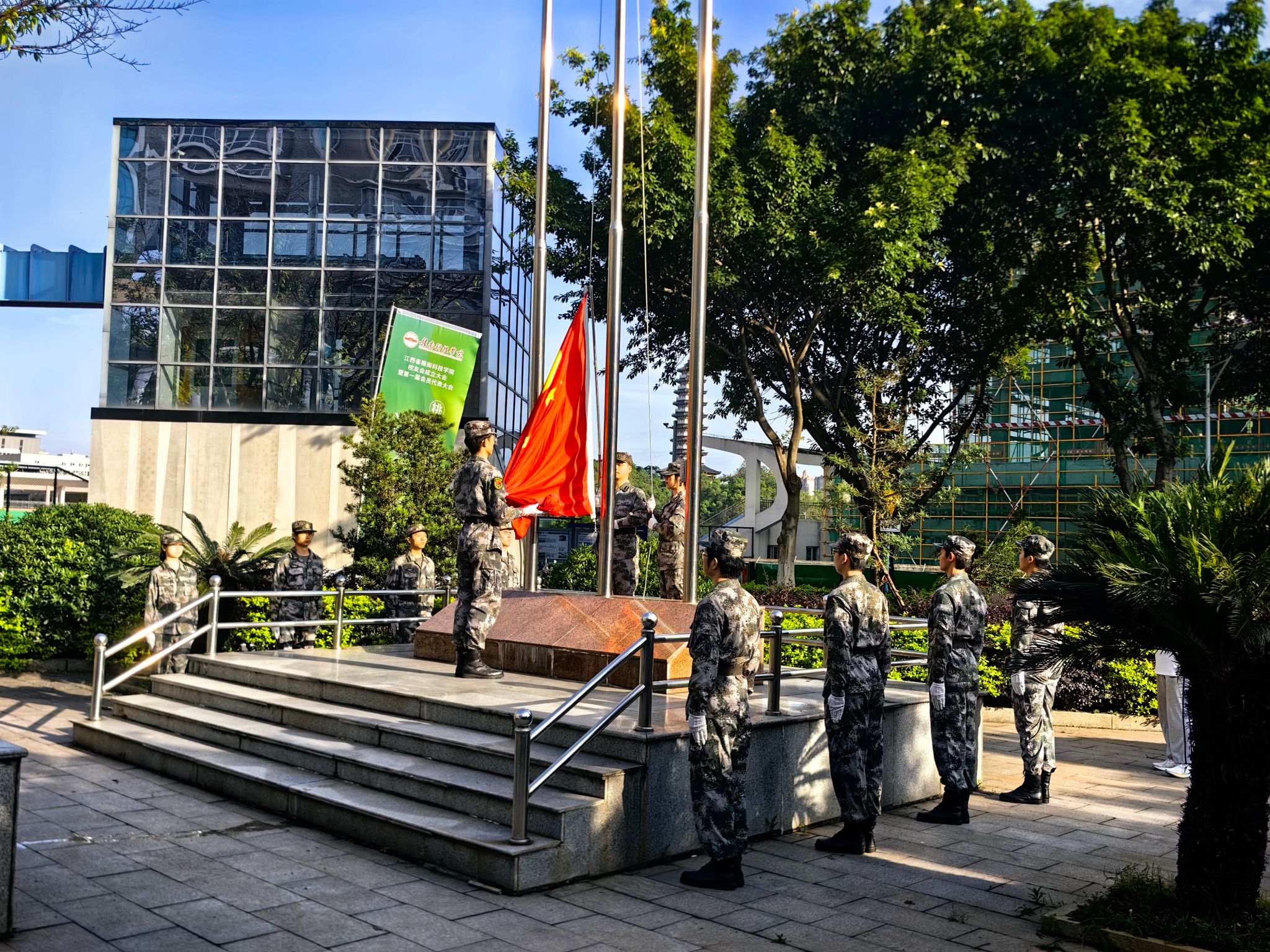 在庄严肃穆的氛围中,五星红旗伴随着雄壮的国歌声缓缓升起,大家行注目礼,表达着对祖国的忠诚与热爱。青年风华正茂的身姿,如同雄鹰猛隼展翅高飞般矫健,又如奇花刚孕起的蓓蕾般明丽而茁壮。