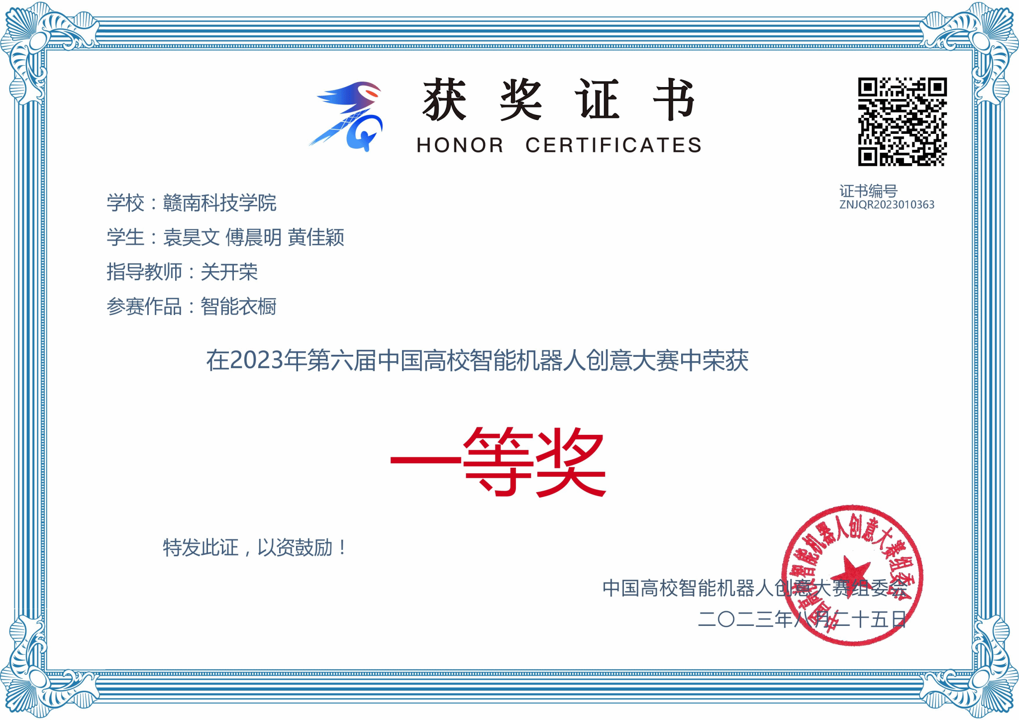 本网讯:近日,第六届中国高校智能机器人创意大赛总决赛公布获奖名单,公司参赛作品经过校赛、省赛选拔和总决赛现场决赛,最终有4支队伍在省赛中获奖,1支队伍参加总决赛。在总决赛中,参赛队员袁昊文,黄佳颖表现出色,获得一等奖1项,取得了公司该项赛事的突破!