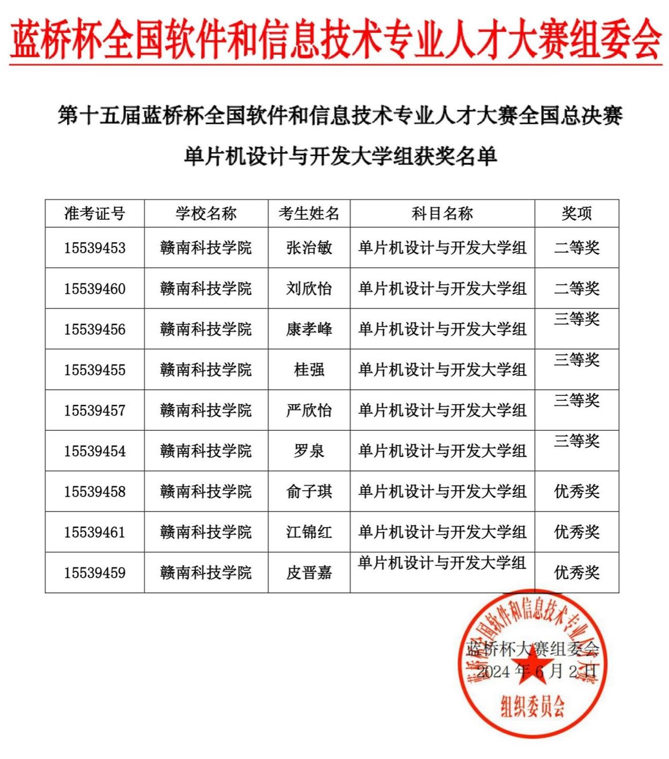 本网讯:近日,第十五届蓝桥杯全国软件和信息技术专业人才大赛全国总决赛圆满落幕,公司学子喜获单片机设计与开发大学组全国二等奖2项、全国三等奖4项,全国优秀奖3项。