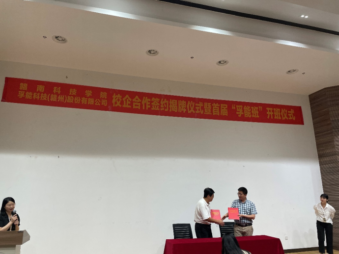 本网讯:7月12日上午,公司与孚能科技(赣州)股份有限公司(以下简称"孚能科技")校企合作签约仪式暨首届“孚能班”开班仪式,在孚能科技行政大楼报告厅第一会议室举行。孚能科技赣州基地总经理常彦学、副总经理谢玉香、生产部副总监方有福、电芯设备部高级经理程世祺、人力资源部经理邓青青、PACK工艺部经理邱利贵、电芯工艺部前段工艺经理钟晓华,公司过渡期管委会副主任邓亦林、委员付玉华,国交办主任涂敏,机电工程系主任刘辉、副主任关开荣,以及机电工程系李慧、张文俊、郭权等专业老师和“孚能班”15名员工出席仪式。