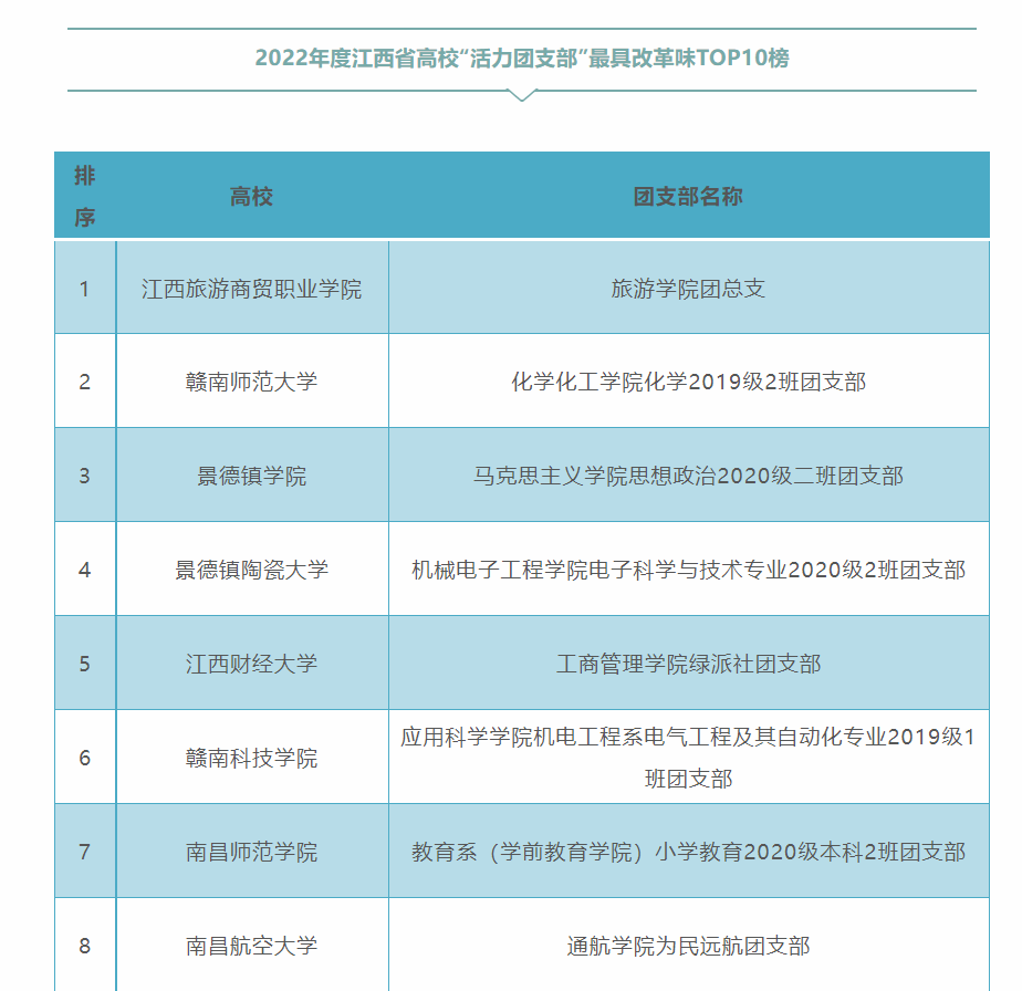 团省委、省学联参考各高校点赞转发数量,结合团支部、社团建设成果和日常工作了解,最终确定《2022年度江西省高校“活力团支部”最具(引领力、组织力、服务力、贡献度、改革味、好作风)TOP10榜》和《2022年度江西省高校“活力社团”TOP10榜》。其中,江西理工大学应用科学公司机电工程系电气工程及其自动化专业2019级1班团支部荣获江西省高校“活力团支部”称号。